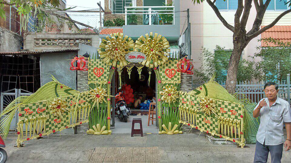 Sau một thời gian vắng bóng, vài năm nay đã xuất hiện trở lại 'kiểu đám cưới ngày xưa' với rạp, cổng được trang trí toàn bằng lá dừa. Tuy mộc mạc, đơn sơ, nhưng thu hút được nhiều người. Không chỉ là cổng cưới hỏi, mà ròn rất nhiều dịp vui khác như đăng khoa, nhà mới, thôi nôi, đón khách… cũng đều được làm cổng để mọi người cùng vui.