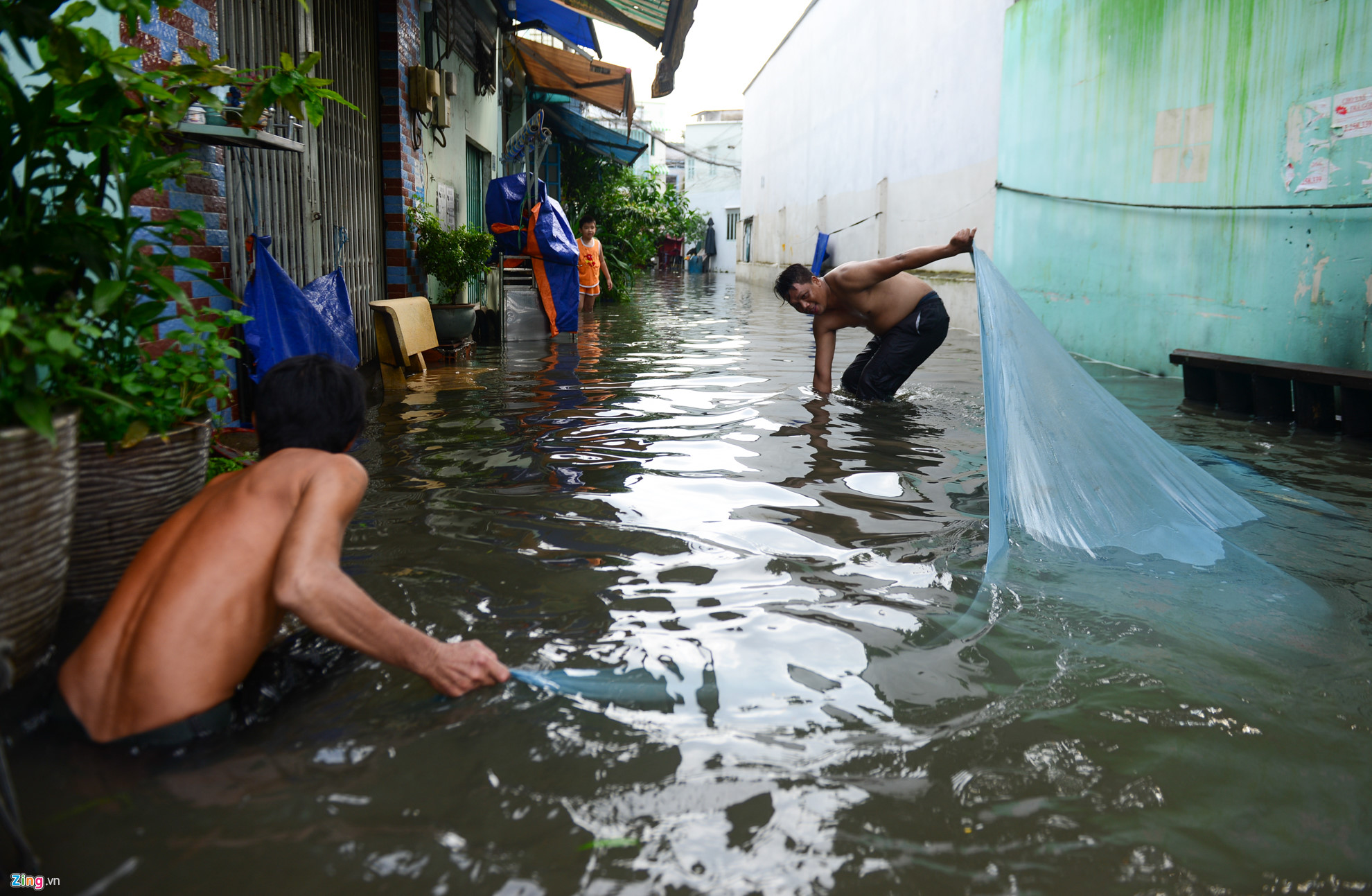 | Anh Nguyễn Văn Út cùng người thân dùng mùng làm lưới bắt cá. Anh Út cho biết trời mưa ngập làm người đi đường bị té và đổ cá ra ngoài, nên anh cùng người thân thử lưới và không ngờ bắt được nhiều cá. |
