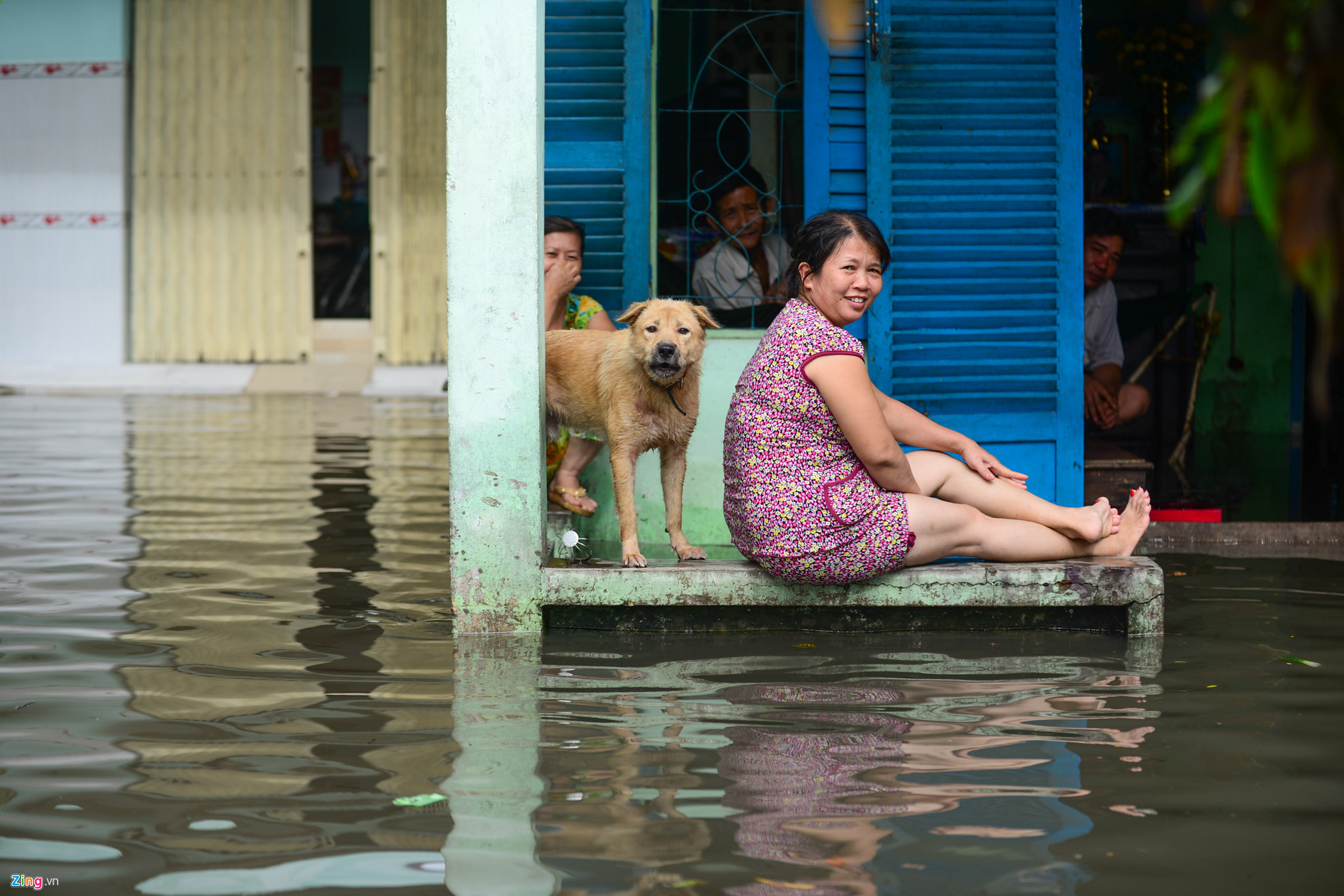 | Chị Nguyễn Thị Xuân ngồi trước nhà chờ nước rút. Chị Xuân cho biết con đường An Dương Vương, quận 6, trước nhà chị cứ mưa là ngập, không làm ăn gì được. |