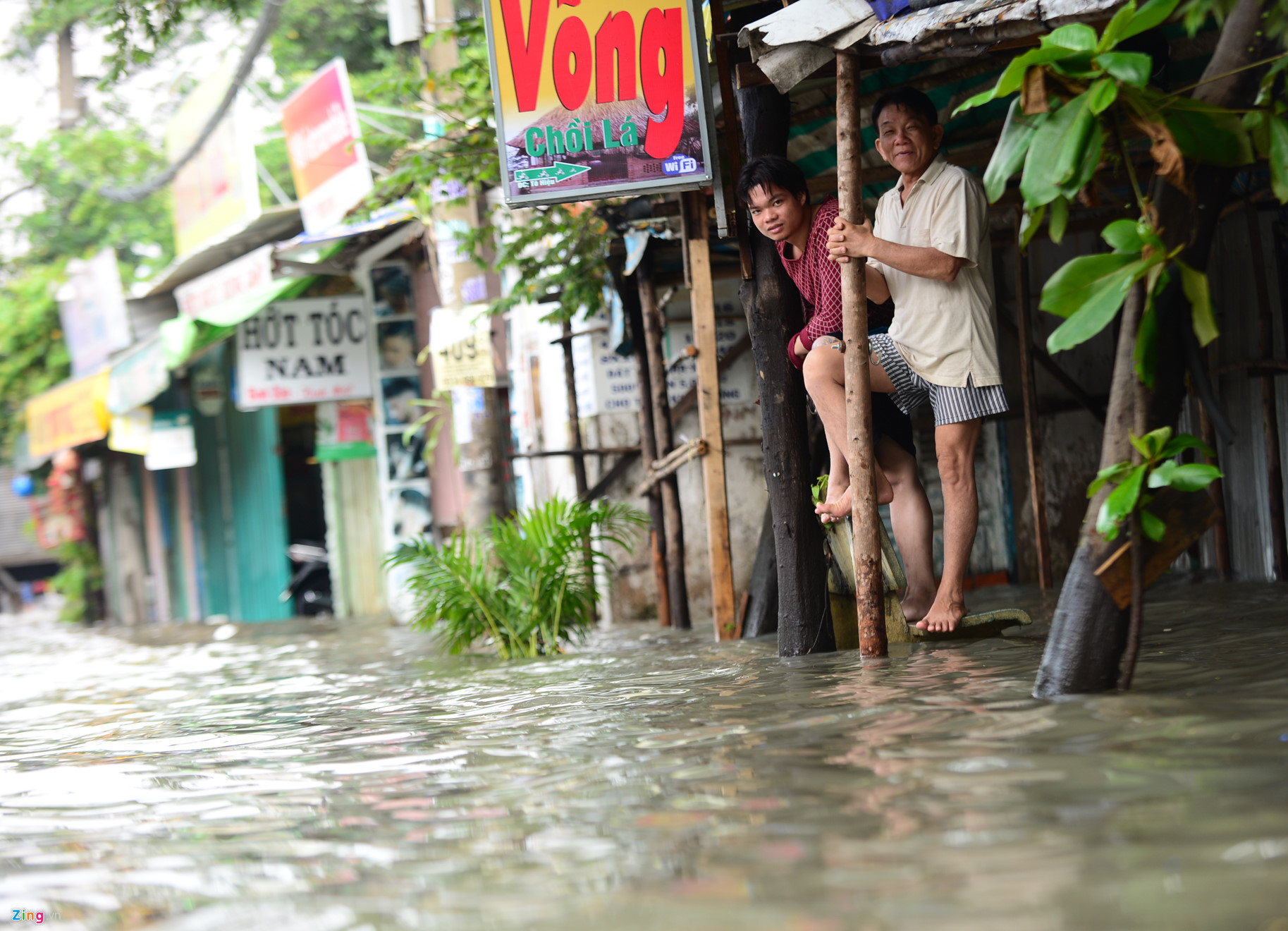 | Anh Nguyễn Hoàng, Lâm Văn Hiền đứng trước quán cà phê, nhìn dòng nước mênh mông than thở: "Sáng giờ có duy nhất một khách, thuê mặt bằng đắt mà cứ mưa là ngập suốt, không làm ăn được gì". |