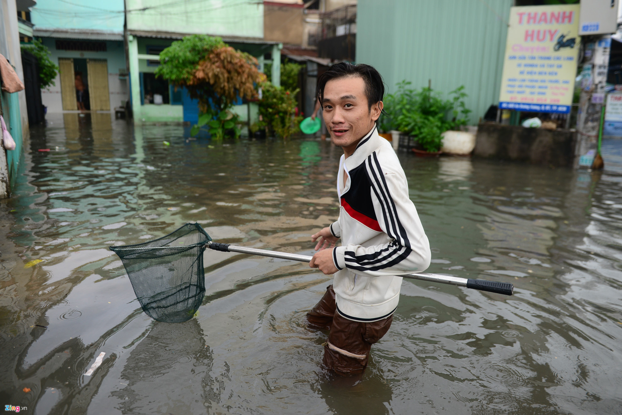 Cơn mưa kéo dài suốt đêm đã làm một số tuyến đường ở Sài Gòn ngập nặng. Một số thanh niên dùng vợt bắt cá trong khi phụ huynh vất vả đưa con tới trường sáng nay, 13/10.