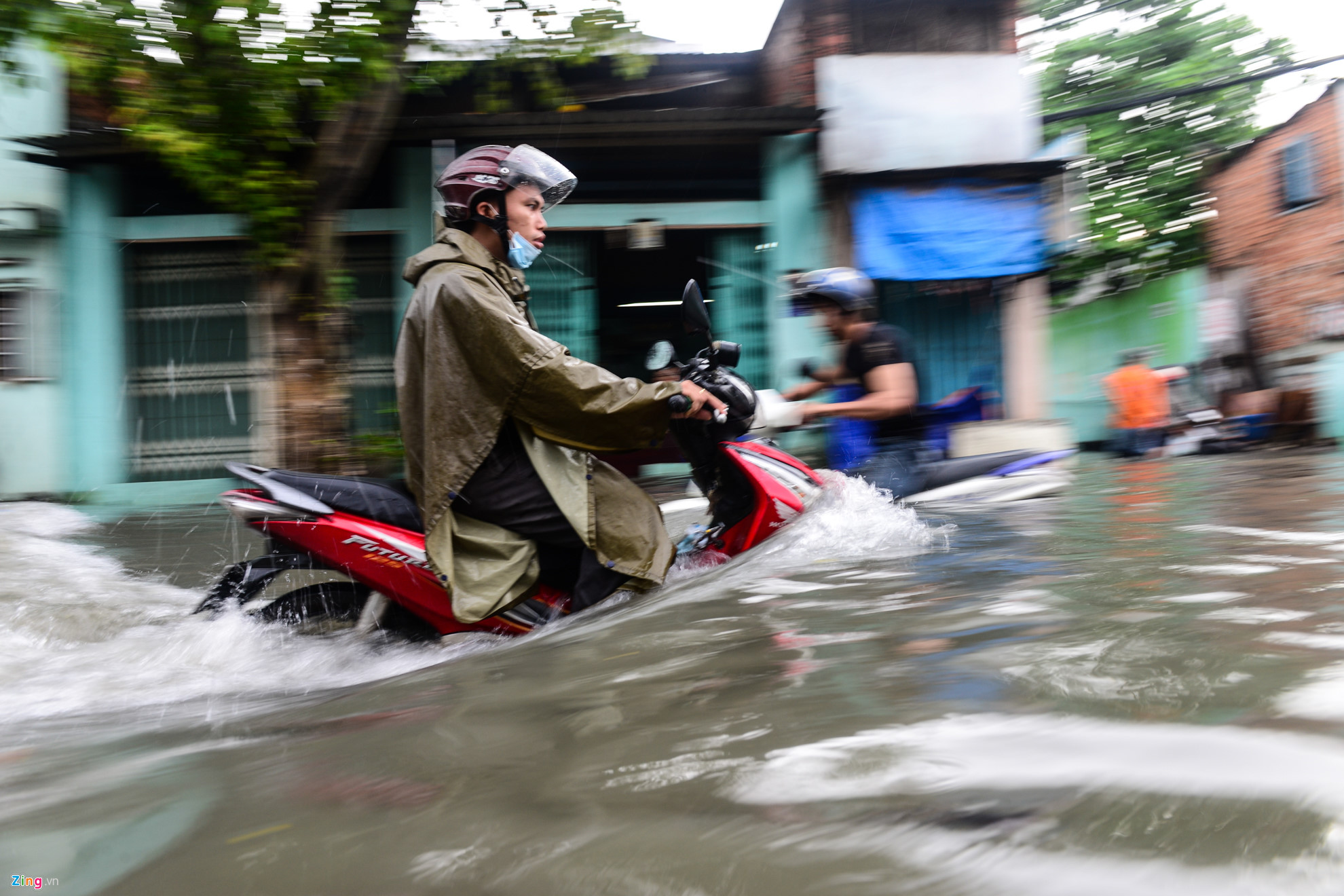 | Lo ngại sẽ bị sụp hố giữa đường ngập nước, người đàn ông dắt xe dựng sát nhà dân chờ nước rút để đi tiếp. |