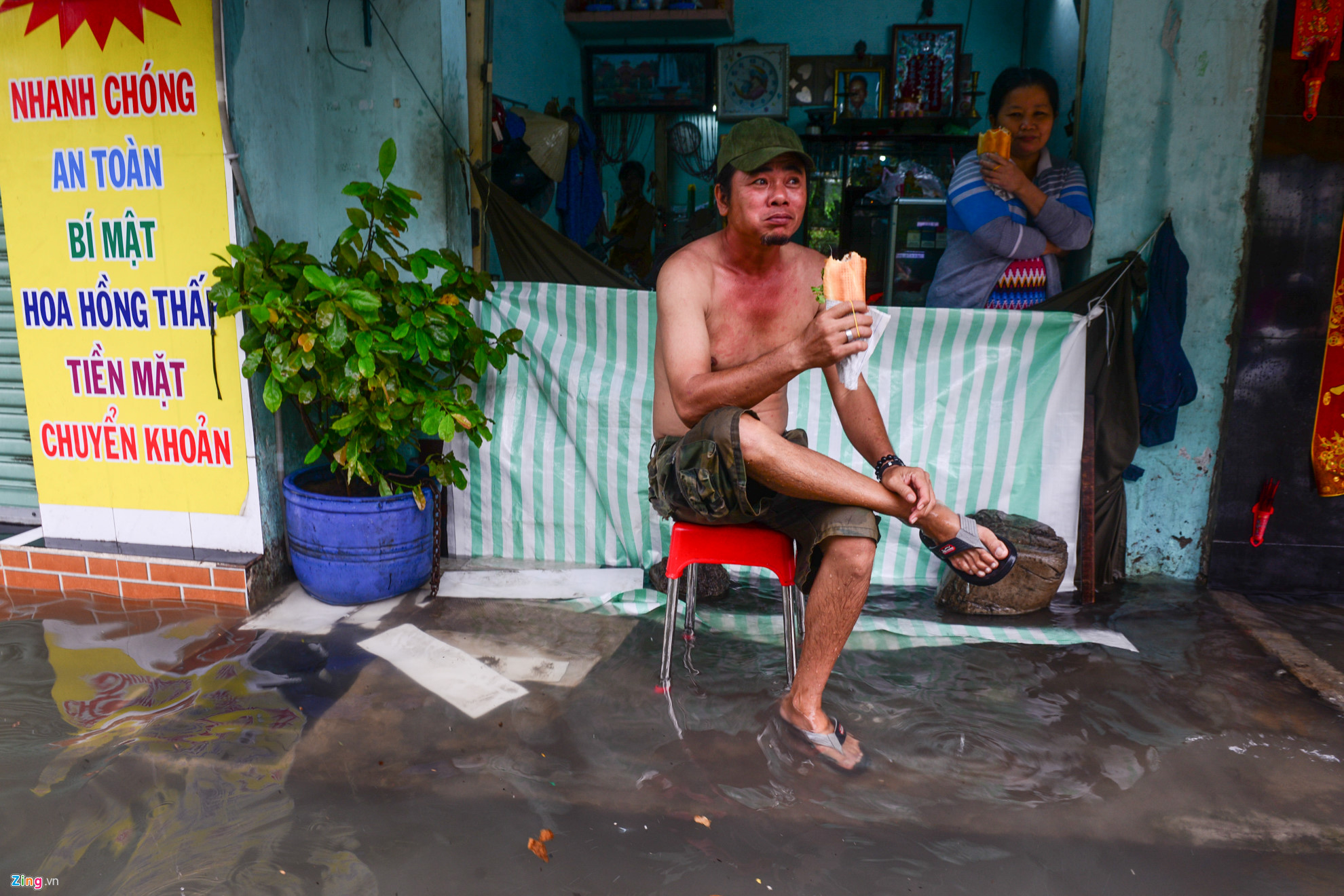 | Anh Tài, vị khách duy nhất trong quán cà phê của anh Hiền, nằm võng uống cà phê từ 5h sáng, anh bị kẹt giữa dòng nước ngập. |