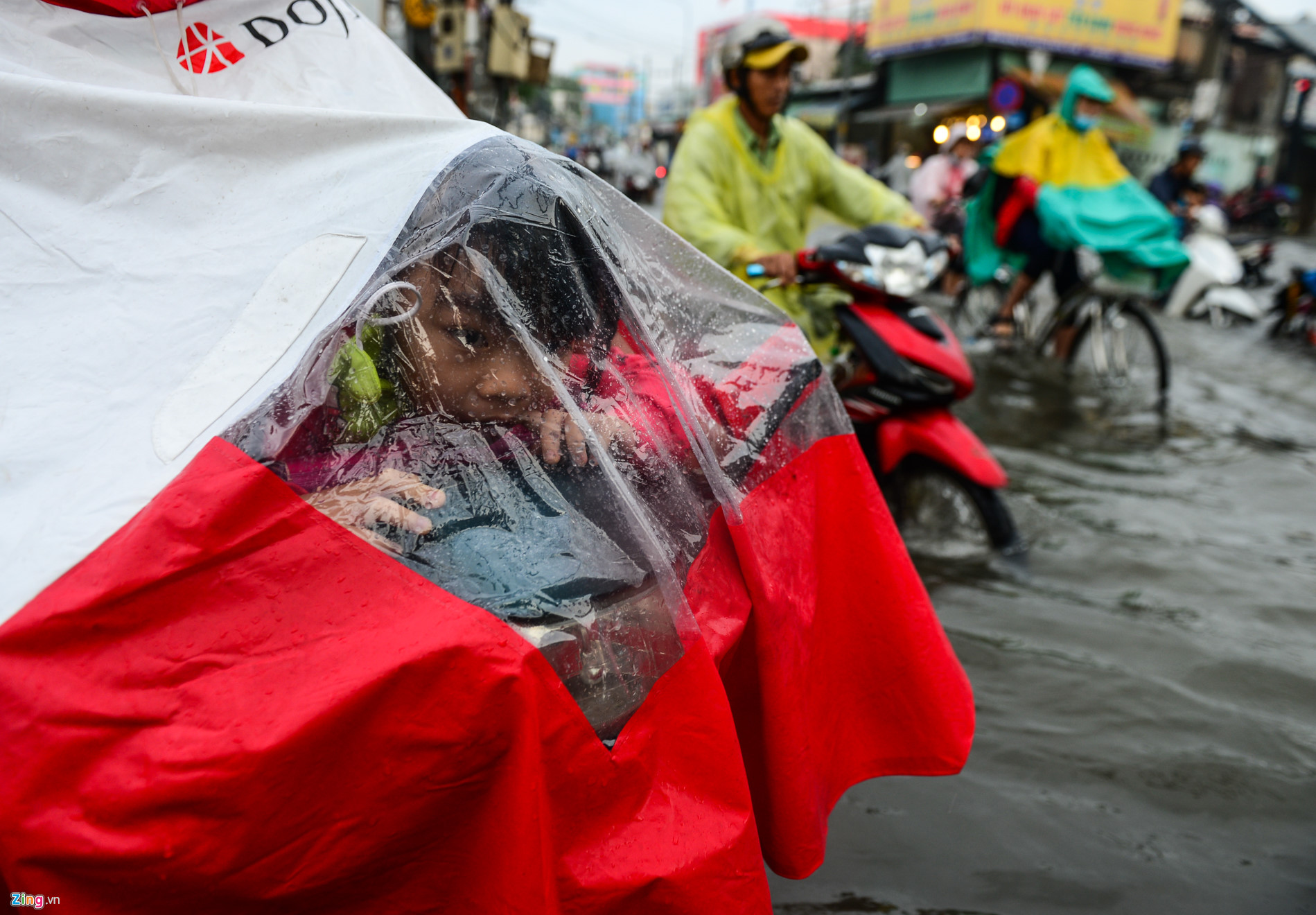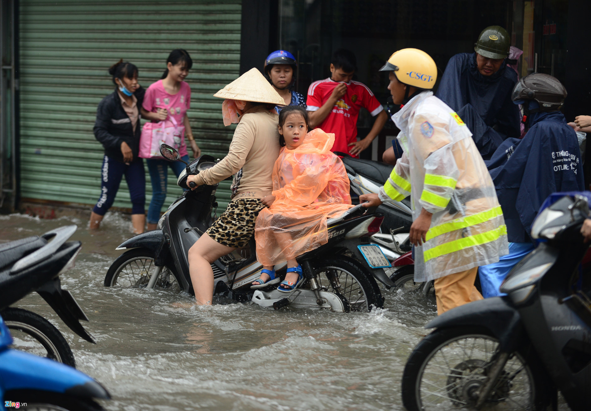 | Một trong những phụ huynh khác vất vả lội nước đưa con đi học trên đường An Dương Vương, quận 6. |