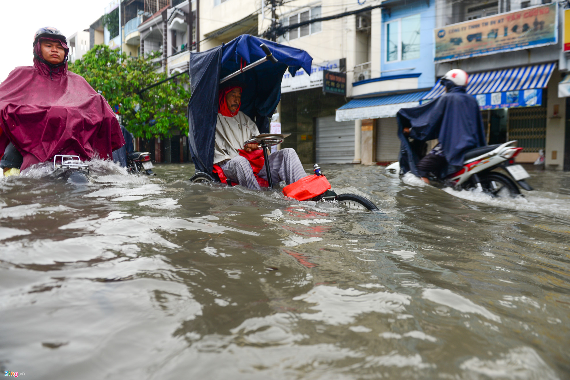 | Trong khi đó, một người đàn ông ngồi xe đạp 3 bánh cố vượt qua đoạn ngập trên đường Phan Anh (quận 6) để bán vé số. |