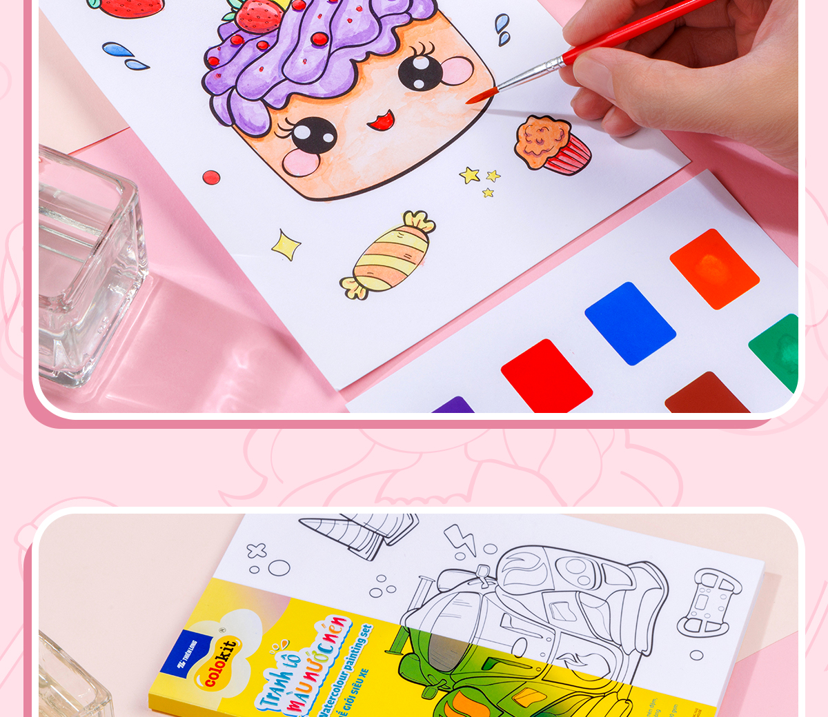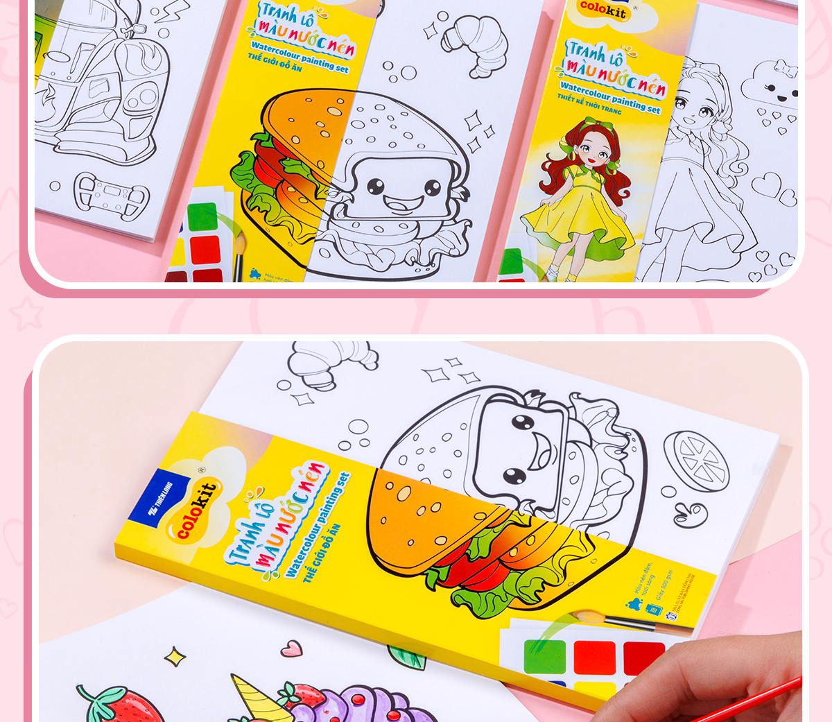 ▪️ Đóng gói: 10 tờ tranh tô màu A5 + 05 tờ màu nước nén A6 (có 08 màu) + 01 cây cọ/ túi/ kiện.